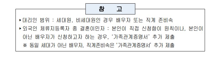 - 세대주가 일괄 신청하거나 본인이 개별 신청 가능. 단 미성년자는 본인 신청 불가