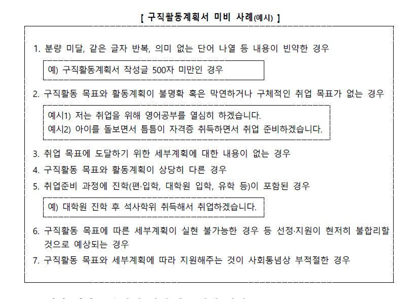 *온라인 신청 시 작성하는 구직활동계획서는 향후 지원금 사용 및 구직활동보고서 작성의 토대가 되므로 본인의 구직활동계획서에 맞게 정확하게 작성해야 합니다. 구직활동계획서의 내용이 미비한 경우에는 보완요청을 할 수 있으며 보완에 응하지 않으면 선정에서 제외처리 됩니다