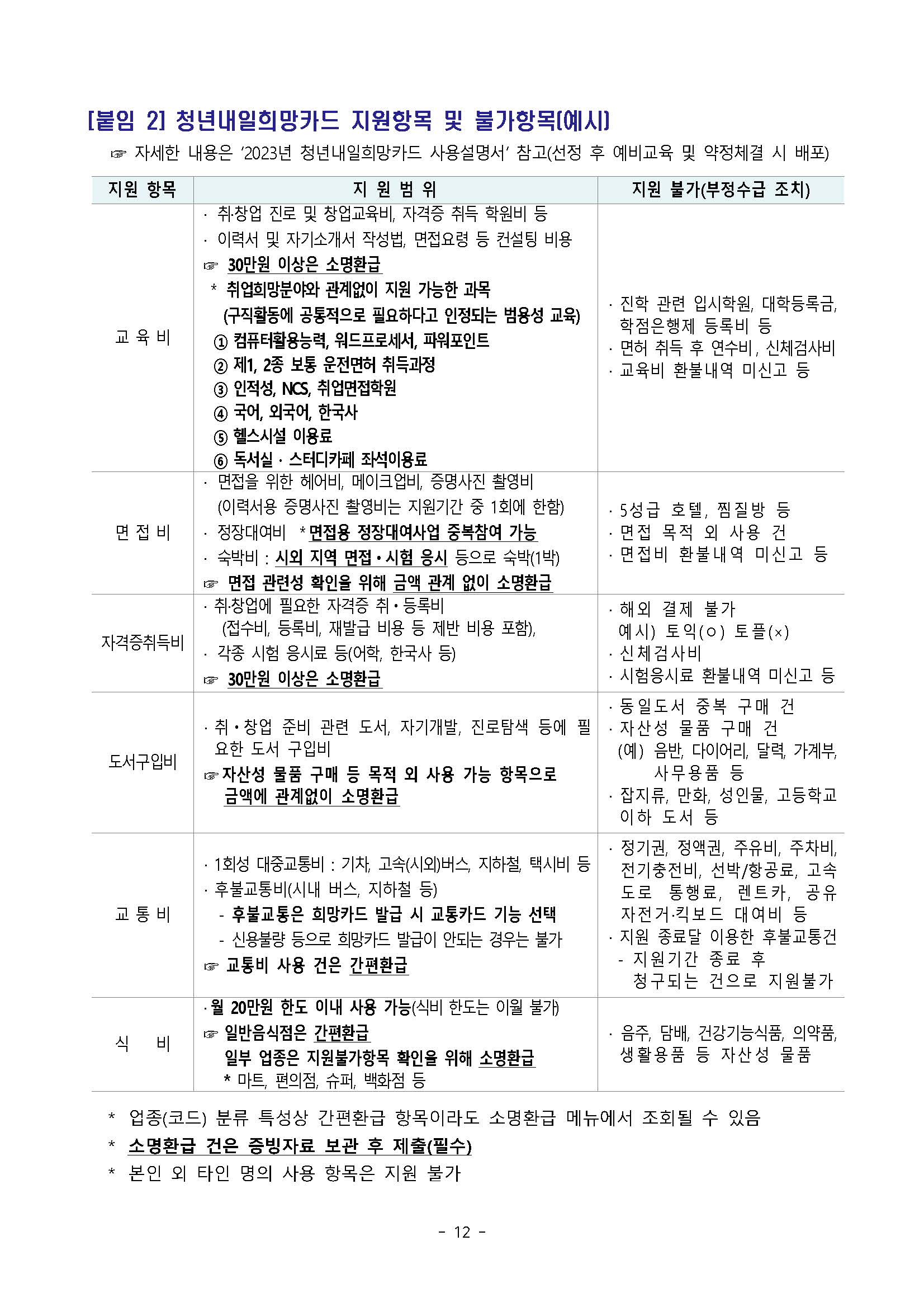 ♣ 청년내일희망카드 지원항목 및 불가항목[예시]