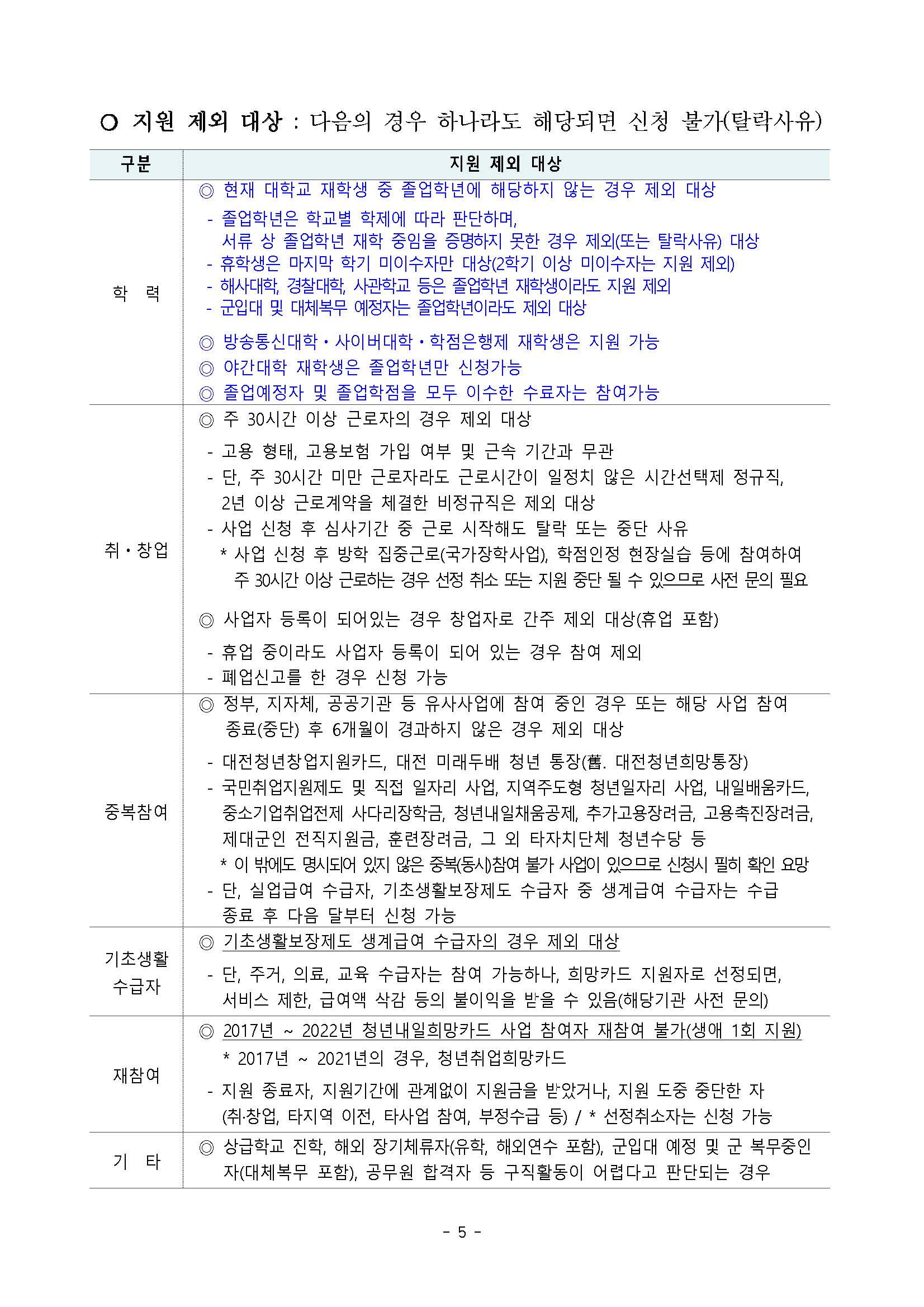 ○ 자격조건은 신청일부터 선정결과 발표일까지 반드시 유지되어야 합니다. 자격변동 (취업. 창업, 대전 이외 타 지역 주소지 이전, 타 지원사업 참여 등) 이 생기면 반드시 본인이 신청해서 취소해야 합니다