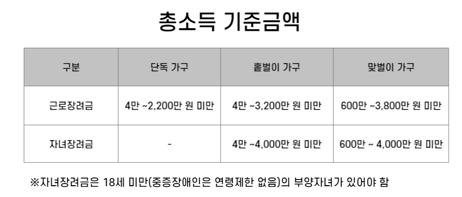 근로. 자녀장려금은 1 가구 1명만 신청가능. 배우자. 부양가족 유무에 따라 단독·홑벌이·맞벌이 가구로 구분