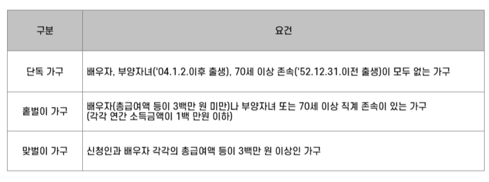신청자격은 가구 구성에 따라 소득. 재산요건을 모두 충족한 가구가 신청대상입니다