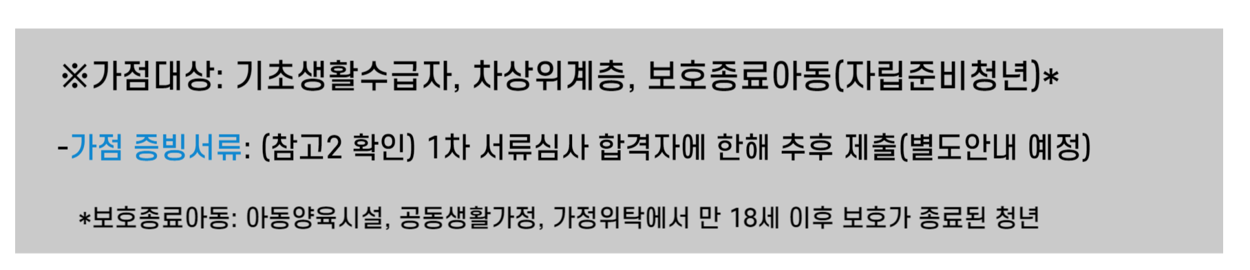 (예시) 팀에 기초생활수급자 1명, 차상위계층 1명, 보호종료아동 1명 → 팀당 1회만 가점 부여