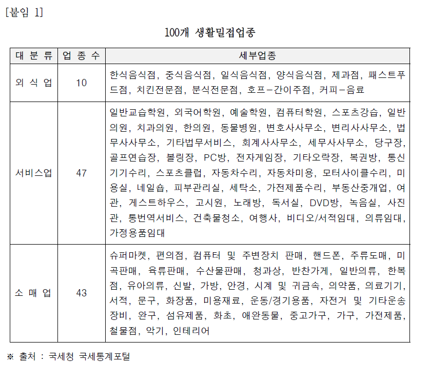 (예시) 외식업, 교육, 여행, 의류, 제품, 도. 소매, 출판, 인테리어 등 100개 생활밀접업종 (붙임 1) 등