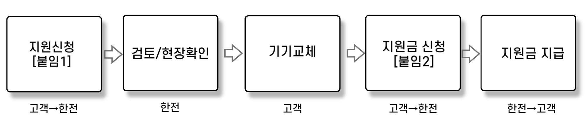 철거 전 기존기기가 '15년 12월 31일 이전 제조제품임을 현장에서 확인을 해야할 필요가 있으므로, 한전의 현장 확인* 후 3개월 이내 신규기기 설치 및 지원금을 신청하는 경우에만 지원금이 지급됩니다
