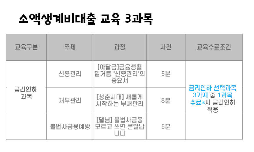 교육은 위의 3과목 중에서 고르시면 되고 5~8분으로 투자하는 것만으로 0.5% 인하가 됩니다. 지금 바로 금융교육을 이수하러 가세요~