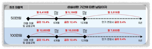 대출이자는 금융교육을 이수할 경우 금리가 0.5% p 인하되며, 50만원 대출 시 최고 월 이자부담은 6,416원 수준입니다