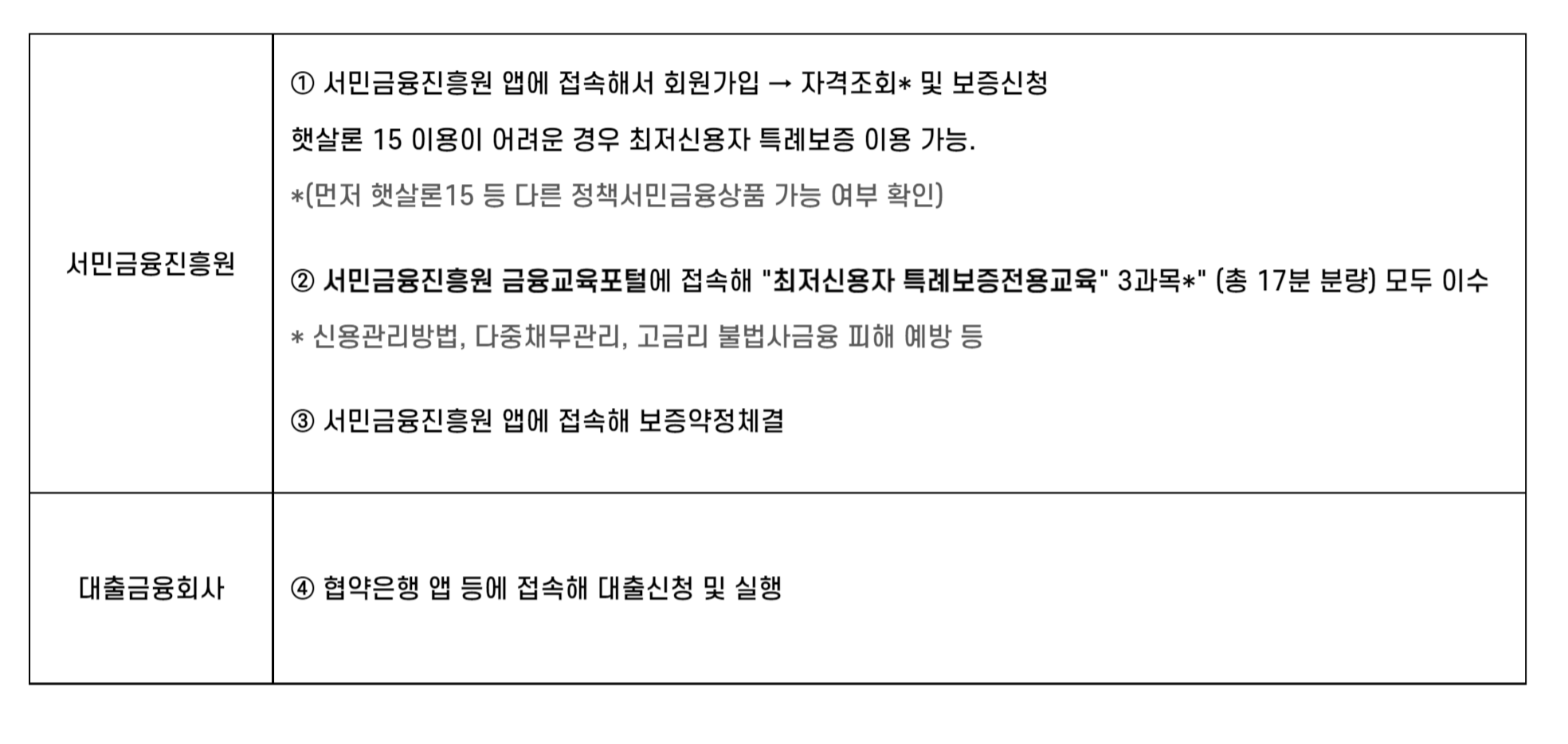| 추가대출 | 최저신용자 특례보증 6개월 이상 정상이용 시 추가대출 1회 가능 (대출상환 완료 후에는 반복이용 가능) *복수 대출이력이 있는 경우 각 계좌의 누적 성실상환기간을 모두 합산해서 신청 (완제 건 포함) . 추가대출의 자격요건은 최초대출의 자격요건을 그대로 이용. |