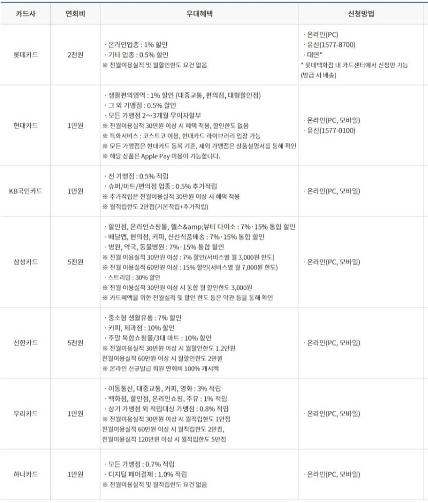 | 카드사 | 연회비 | 신청바로가기 |