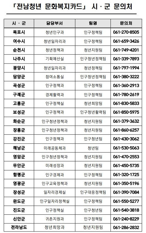 ♣전남청년 문화복지카드 시.군 문의처 확인하기