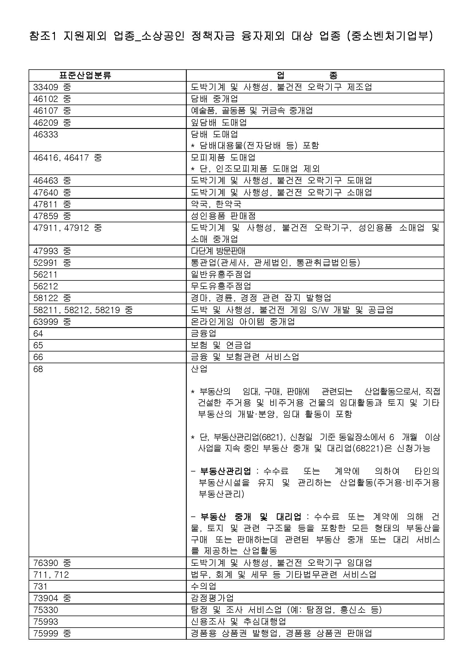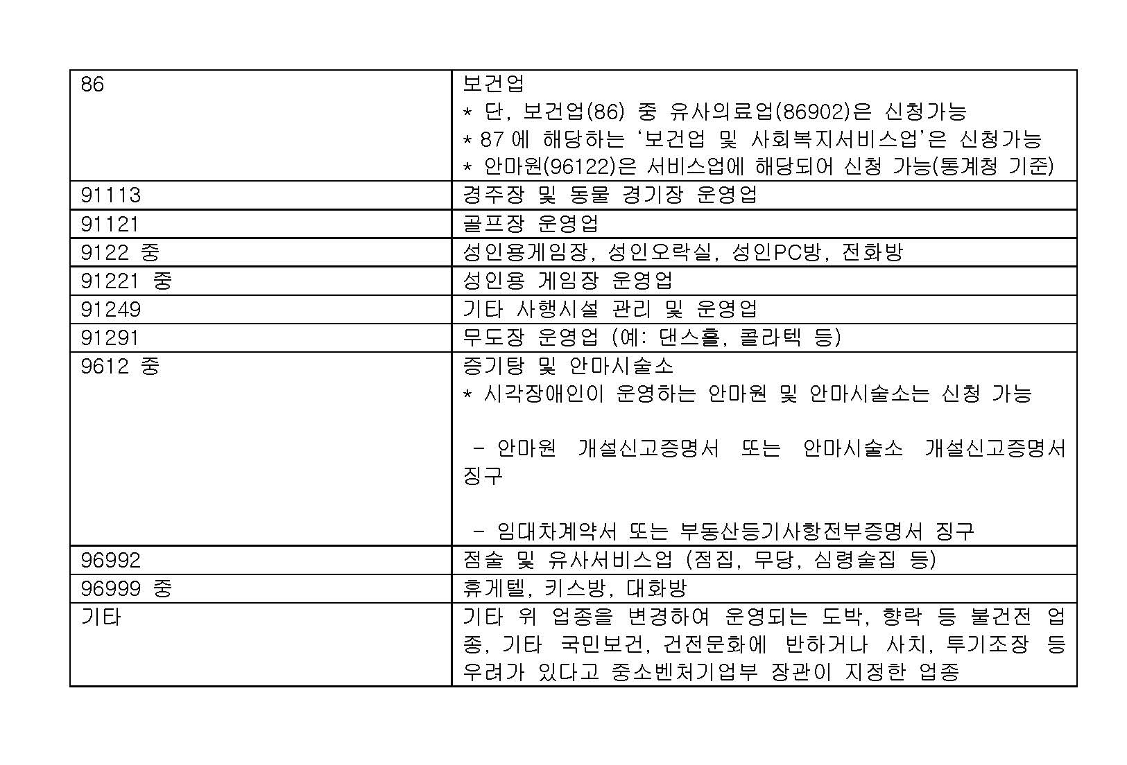 ※중소벤처기업부 지원제외 업종_소상공인 정책자금 융자제외 대상 업종